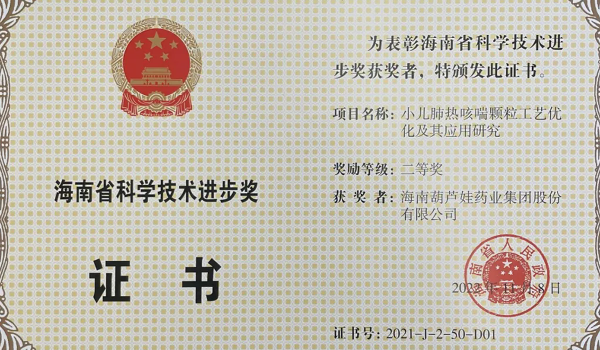 GD视讯药业集团申报的专利“克咳片及其制备方法”荣获 第四届海南省专利奖金奖