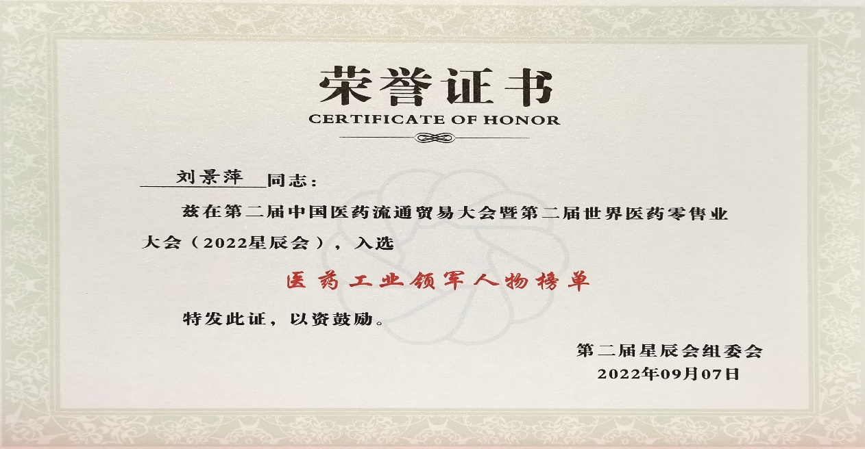 本次星辰会期间,GD视讯斩获颇丰,获得多项行业奖项及荣誉。在开幕式上,刘景萍董事长荣获“医药工业领军人物”称号。