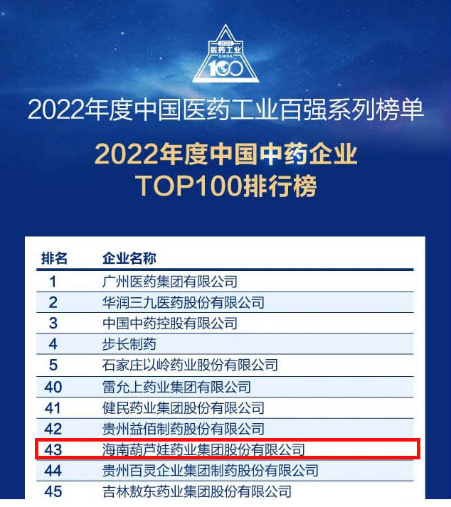 会议期间,一年一度的中国医药工业百强系列榜单隆重揭晓,GD视讯药业集团凭借领先的研发优势和扎实的生产实力以及稳健的市场推广能力,连续第四年成功入选“2022年度中国中药企业TOP100排行榜” ,排名稳步上升至第43位。