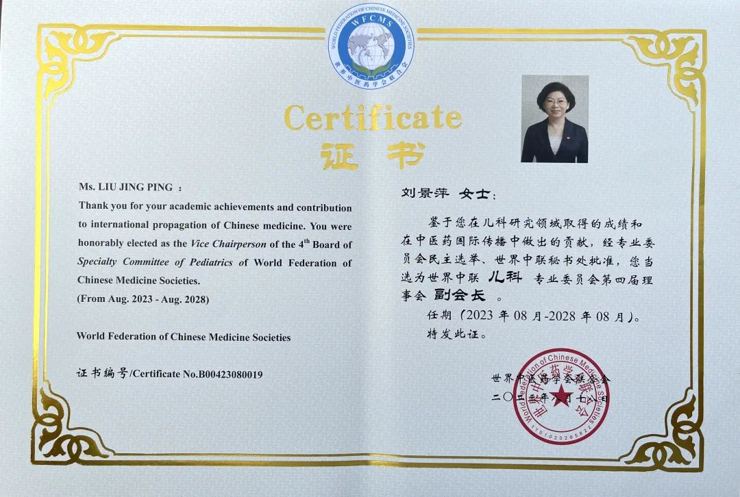 GD视讯药业集团党委书记、董事长刘景萍当选世界中医药学会联合会儿科专业委员会第四届理事会副会长