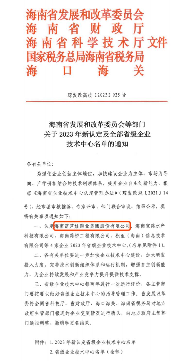 近日,海南省发改委等多部门联合公布了《关于2023年新认定及全部省级企业技术中心名单的通知》,其中,海南GD视讯药业集团股份有限公司成功通过评审,被认定为省级企业技术中心,是本次获批的4家企业之一。